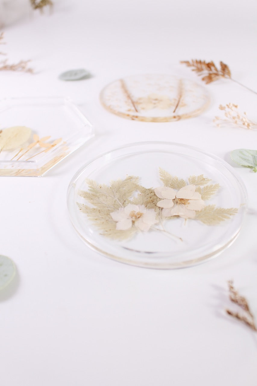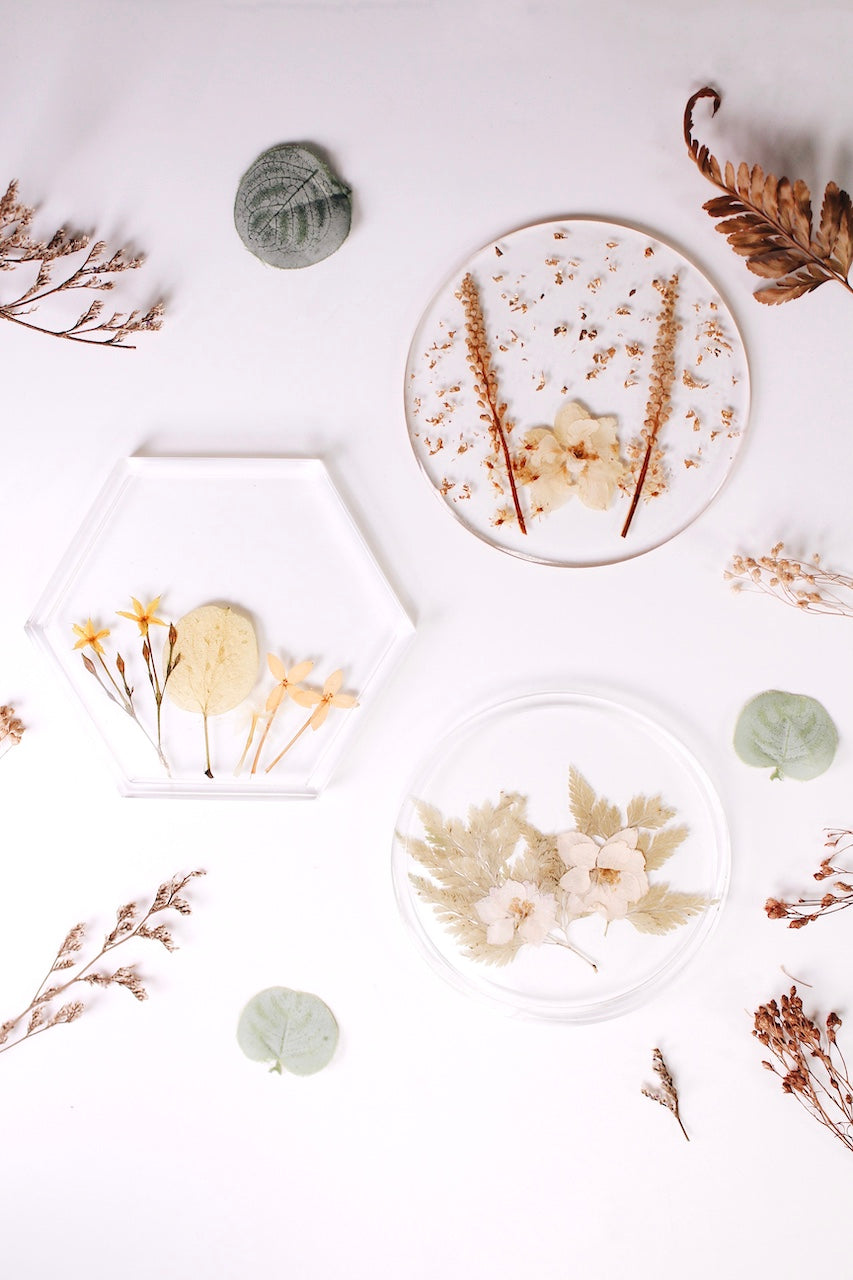 The Pressed Flower Resin Coaster comes in either Walled Coasters or Tray Coasters.